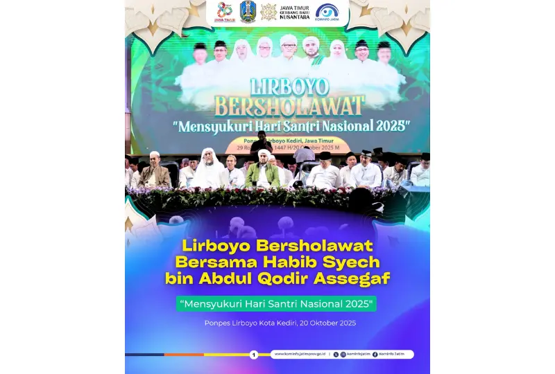 Kominfo Jatim - Ribuan santri dan masyarakat dari berbagai daerah memadati Lapangan Barat Aula Al-Muktamar Pondok Pesantren Lirboyo, Kota Kediri, dalam kegiatan Lirboyo Bersholawat bertema “Mensyukuri Hari Santri Nasional 2025”.
