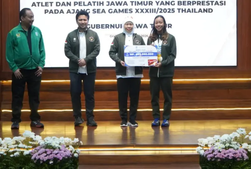 Kominfo Jatim - Gubernur Jawa Timur Khofifah Indar Parawansa memberikan bonus kepada atlet dan pelatih asal Jawa Timur yang berkontribusi menyumbangkan medali bagi Indonesia pada ajang SEA Games XXXIII/2025 Thailand. Penyerahan bonus digelar di Gedung Negara Grahadi, Surabaya, sebagai bentuk apresiasi atas prestasi atlet Jawa Timur di level internasional.