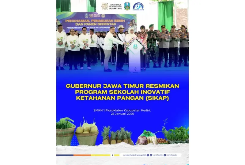 Kominfo Jatim - Gubernur Jawa Timur Khofifah Indar Parawansa secara resmi meluncurkan program Sekolah Inovatif Ketahanan Pangan (SIKAP) di SMKN 1 Plosoklaten, Kabupaten Kediri. Program ini menjadi bagian dari upaya strategis Pemerintah Provinsi Jawa Timur dalam memperkuat ketahanan pangan berkelanjutan melalui pendekatan berbasis pendidikan.