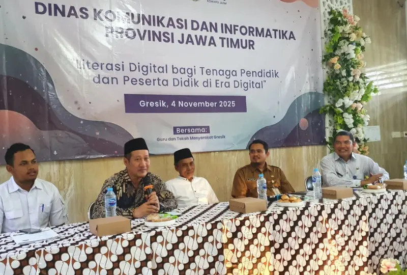 Kominfo Jatim - Dinas Komunikasi dan Informatika (Kominfo) Provinsi Jawa Timur bersama DPRD Provinsi Jawa Timur menggelar kegiatan peningkatan literasi digital aspiratif di Kabupaten Gresik. Program ini menyasar para guru dan tokoh masyarakat sebagai garda depan dalam mengedukasi publik agar lebih bijak menyikapi informasi di ruang digital yang kian semrawut oleh hoaks.