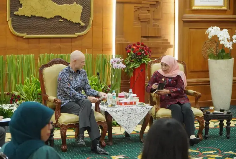 Gubernur Jawa Timur Khofifah Indar Parawansa menerima kunjungan Konsul Jenderal Amerika Serikat di Surabaya, Christopher Green, di Gedung Negara Grahadi. Pertemuan ini membahas kerja sama strategis antara kedua negara dalam bidang pendidikan, kesehatan, dan investasi yang berpotensi memperkuat pembangunan berkelanjutan di Jawa Timur.